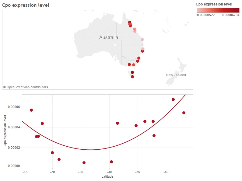 This data set contains expression levels of the couch potato (cpo) locus relative to the housekeeping gene RpL11 in 4-day old females of 15 D. melanogaster populations collected in 2008 (Fig. 5).